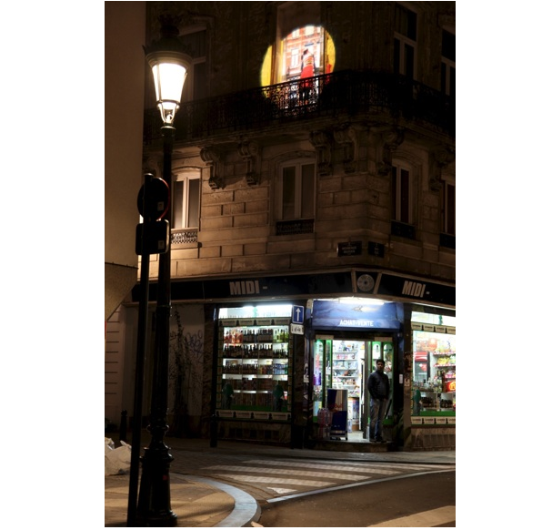 The artistic intervention consists in the projection of round images all along the route, like a series of holes through the walls, inviting passers-by to raise their head to see or imagine the interiors and the living inside the buildings.